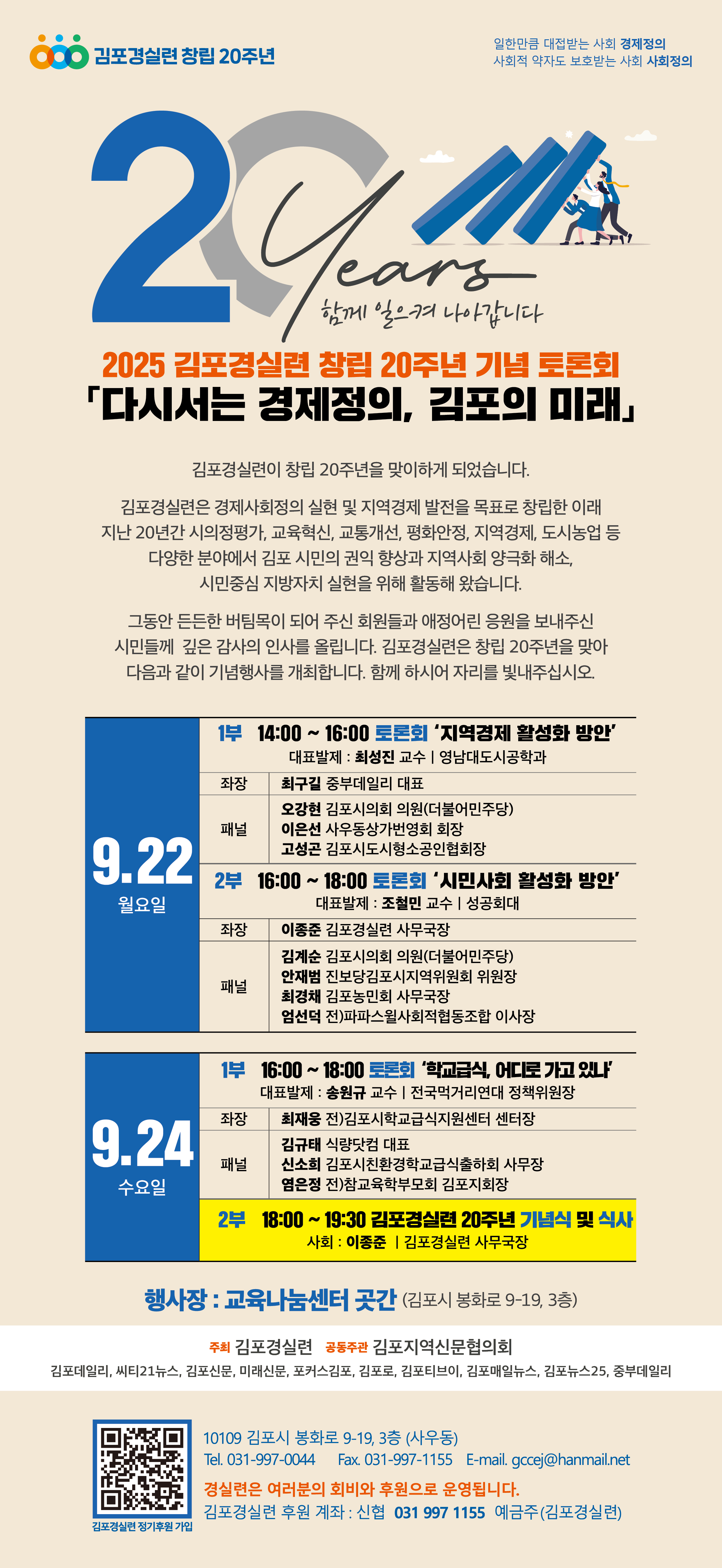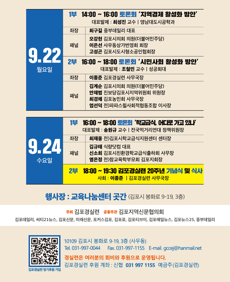 24일 세 번째 토론회 뒤인 오후 6시부터는 김포경실련 창립 20주년 기념식이 같은 장소에서 진행된다.
