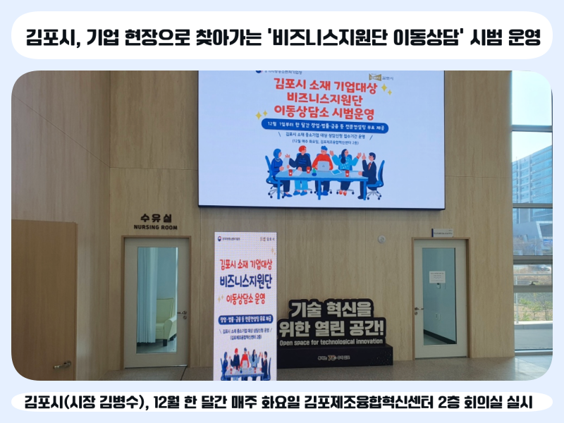 김포시(시장 김병수)는 12월 한 달간 매주 화요일 김포제조융합혁신센터 2층 회의실에서 중소벤처기업부 ‘비즈니스지원단’과 연계한 「비즈니스지원단 이동상담소」를 시범 운영한다고 밝혔다.