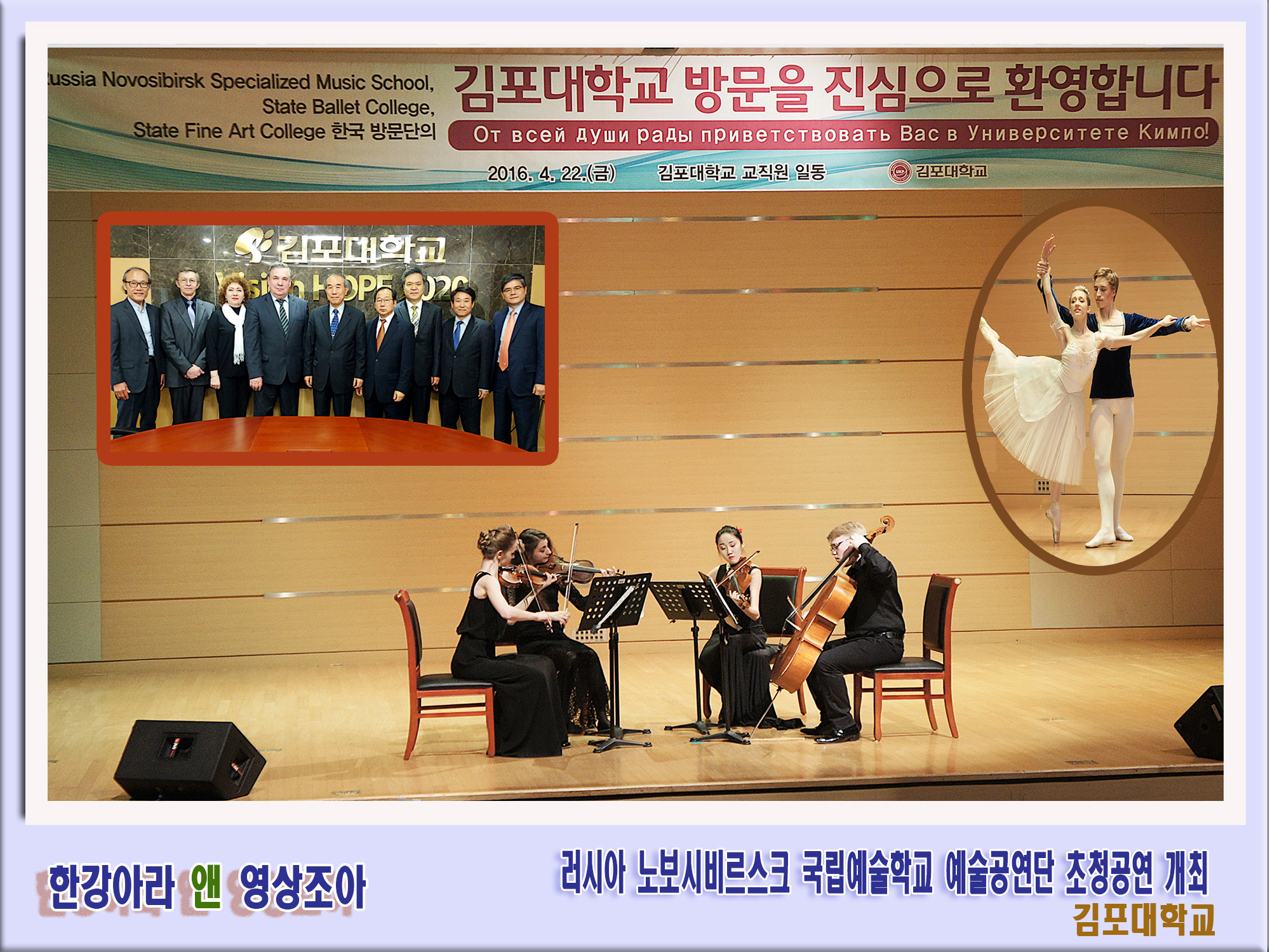 김포대학교(총장 김재복)는 지난 4월 22일 러시아 노보시비르스크 소재 국립 발레·음악·미술학교 예술공연단을 초청하여 다양한 공연 및 미술전시회를 개최하였다.
