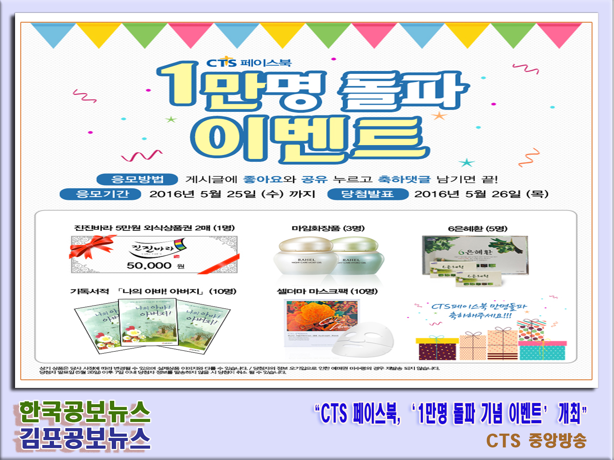 순수복음방송 CTS기독교TV(회장 감경철, 이하 CTS)는 ‘CTS 공식 페이스북(이하 CTS 페이스북)’ 친구 1만명 돌파를 기념해 감사 이벤트를 개최한다.