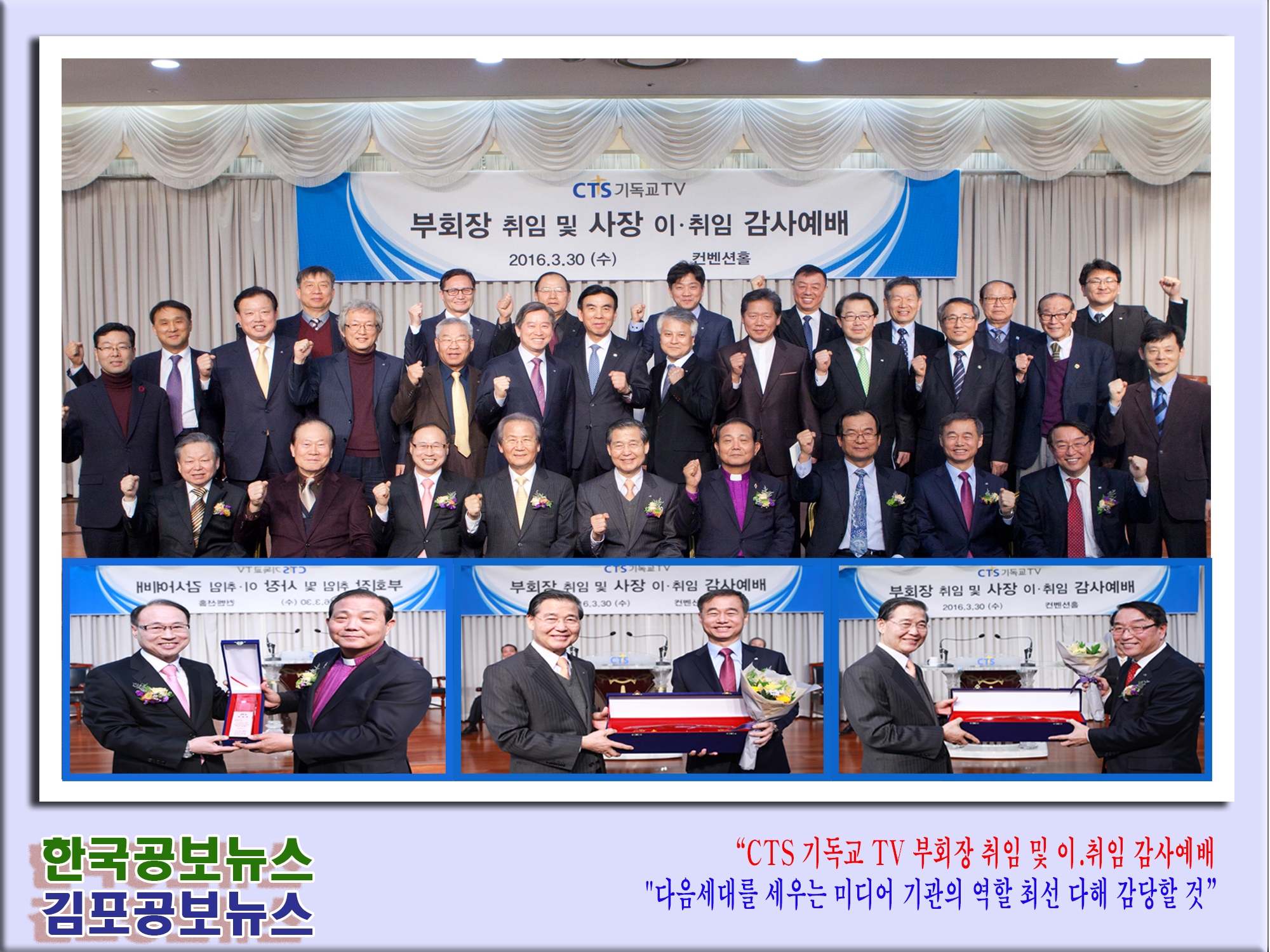 순수복음방송 CTS기독교TV(회장 감경철 이하 ‘CTS’)는 30일 CTS멀티미디어센터에서 ‘부회장 취임 및 사장 이취임 감사예배’를 개최하고, 교계인사 200여명이 참석한 가운데 이민우 부회장의 취임과 이영표, 김관상 사장의 이·취임식을 진행했다.