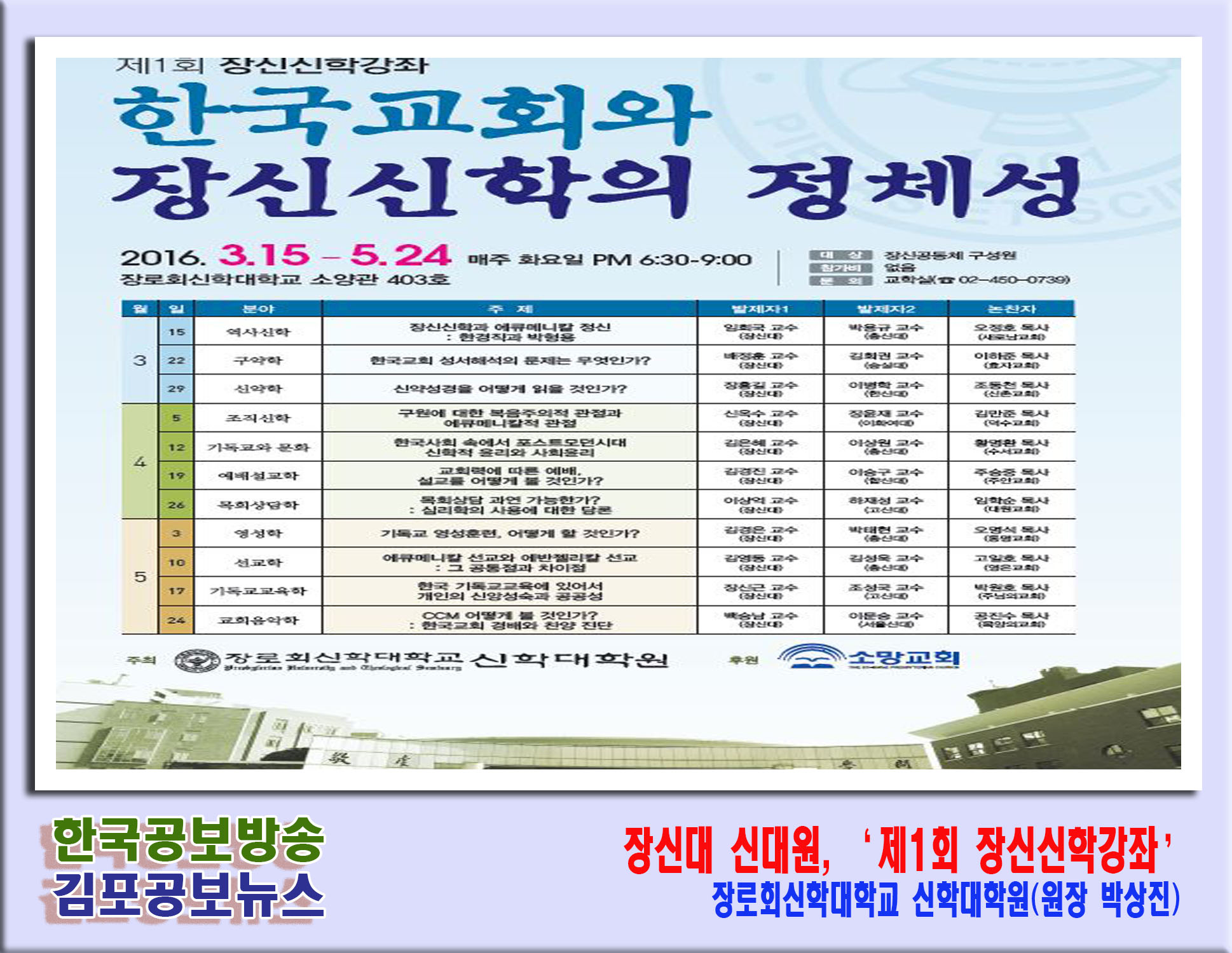 장로회신학대학교 신학대학원(원장 박상진)이 오는 15일부터 5월 24일까지 서울 광진구 장로회신학대학교 소양관에서 ‘제1회 장신신학강좌’를 개최한다.