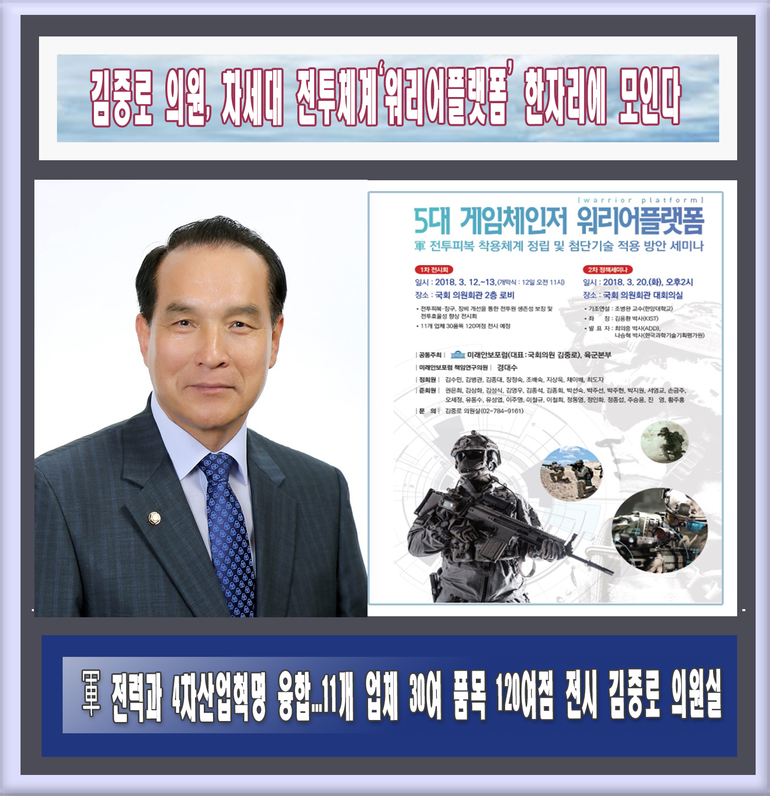 국회 국방위원회 간사 김중로의원(바른미래당)은 미래안보포럼·육군본부와 공동 주관으로 3월 12일(월)부터 이틀간 국회의원회관 2층 로비에서 ‘5대 게임체인저 워리어플랫폼-軍 전투피복 착용체계 정립 및 첨단기술 적용방안’ 전시회를 개최하고, 연이어 20일(화) 국회의원회관 대회의실에서 정책세미나를 개최한다고 밝혔다.