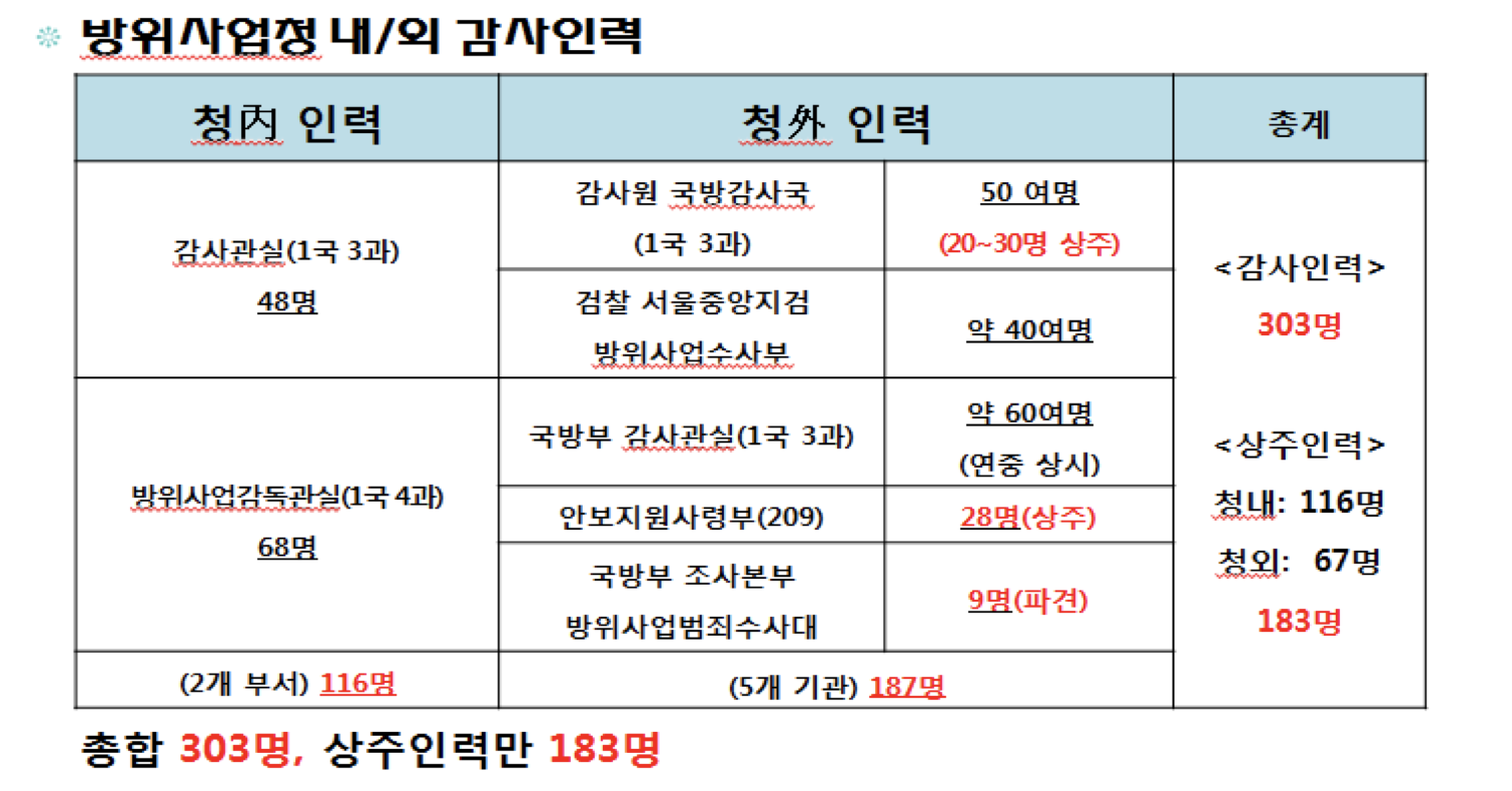 여기에 감사원파견인력 약 50여명(20~30명상주), 검찰 파견인력 약 40여명, 국방부 감사관실 파견인력 약 60여명(연중상시), 안보지원사령부 파견인력 28명(상주), 국방부 조사본부 방위사업범죄수사대 9명(파견)으로 구성되어 있는 청사외부인력 187명도 상주와 파견을 오고가며 방사청 감사 업무를 맡고 있다.