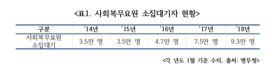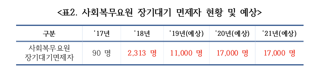 병무청은 이를 해소하기 위한 대책 중 하나로 소집대기중인 사회복무요원의 대기기간을 축소하는 방안을 발표했으나, 이로 인해 17년 90명에 불과했던 장기대기 면제자가 올해는 2,313명로 폭증했고, 내년에는 11,000명(예상)으로 증가할 예정이다.