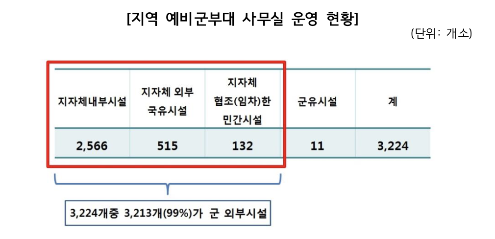 국회 국방위원회 김중로 의원(바른미래당)이 육군본부로부터 받은 자료에 따르면 지역 예비군부대 사무실의 99%가 군외부에 있어 예비전력관리 군무원 5급(예비군 동대장)의 관리가 사실상 힘든 것으로 밝혀졌다.