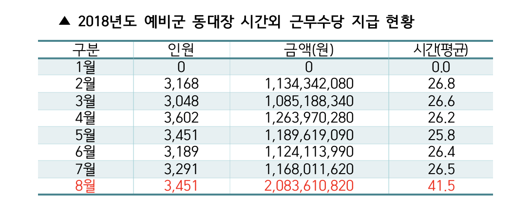 이를 증명하듯 올해 예비군 동대장의 시간외근무수당지급현황을 살펴보면 한시적 확대가 실시된 올해 8월 초과근무수당신청 시간과 지급액이 2배로 증가했다. 7월까지 평균 26.5시간 지급액은 11억원 규모였지만, 시간외근무수당 최대 지급 시간이 28시간에서 57시간으로 증가하자 8월 평균 시간은 41.5시간, 지급된 금액만도 무려 20억여원에 달했다.