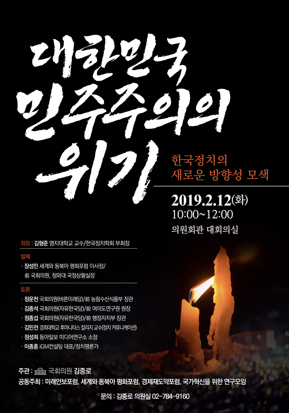 바른미래당 김중로 의원이 주관하고 미래안보포럼, 세계와 동북아 평화포럼, 자유민주포럼, 경제재도약포럼, 국가혁신을 위한 연구모임이 공동주최하는 이번 토론회는 ‘대한민국 민주주의의 위기-한국정치의 새로운 방향성 모색’이라는 주제로 오는 12일 화요일 오전 10시에 국회 대회의실에서 개최될 예정이다.