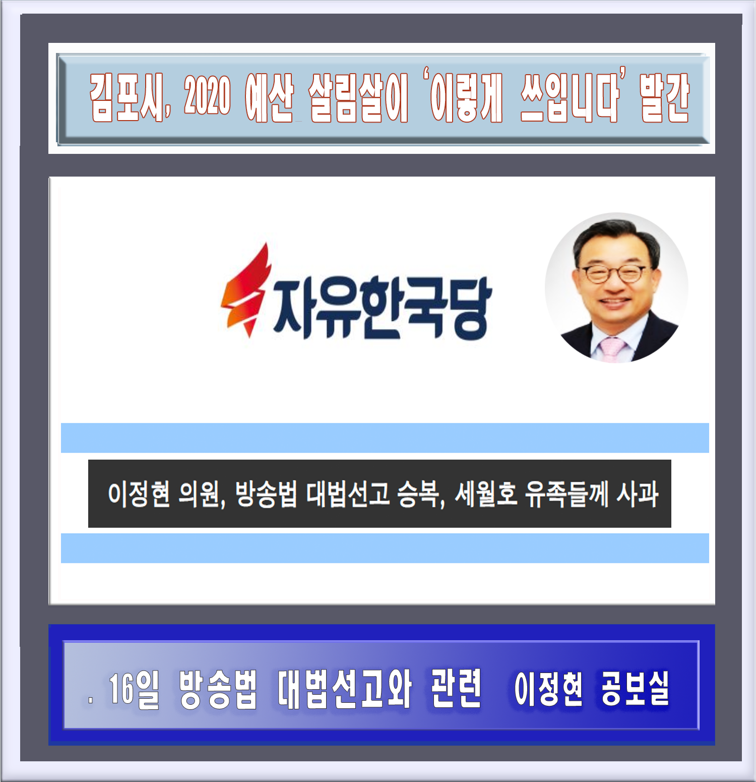 이 의원은 “재판이 진행 되는 동안 언론이나 정치 무대에서 일절 개인적 입장을 개진하지 않은 이유는 혹시나 법질서에 대한 신뢰를 훼손하거나 정치적 의사를 형성해 불필요한 정쟁을 초래할까 우려해서였다.”고도 했다.