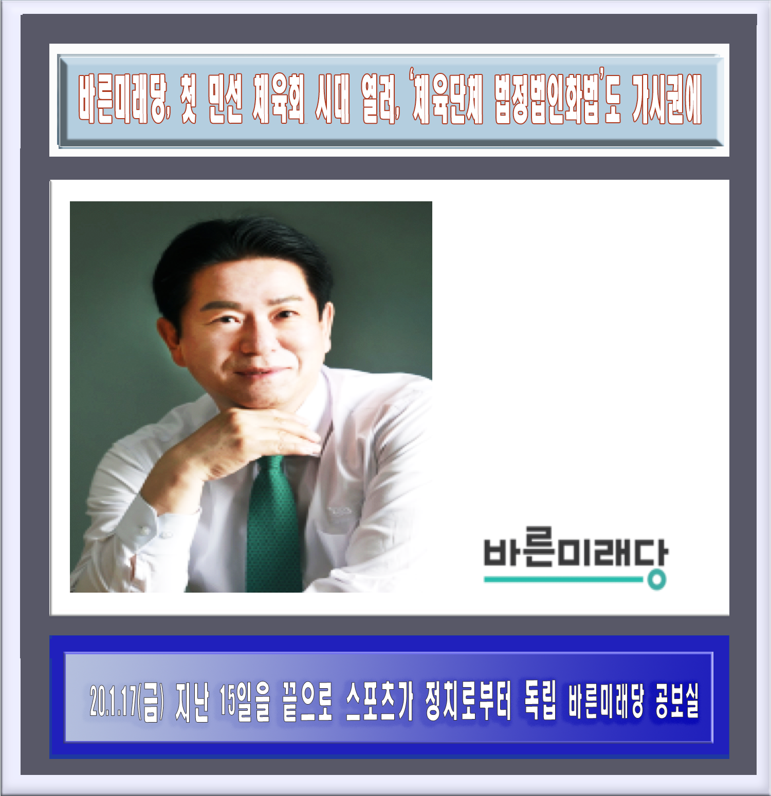 바른미래당 이동섭 원내대표 권한대행은 의원은 20.1.17(금) 지난 15일을 끝으로 스포츠가 정치로부터 독립되었다고 밝혔다.
