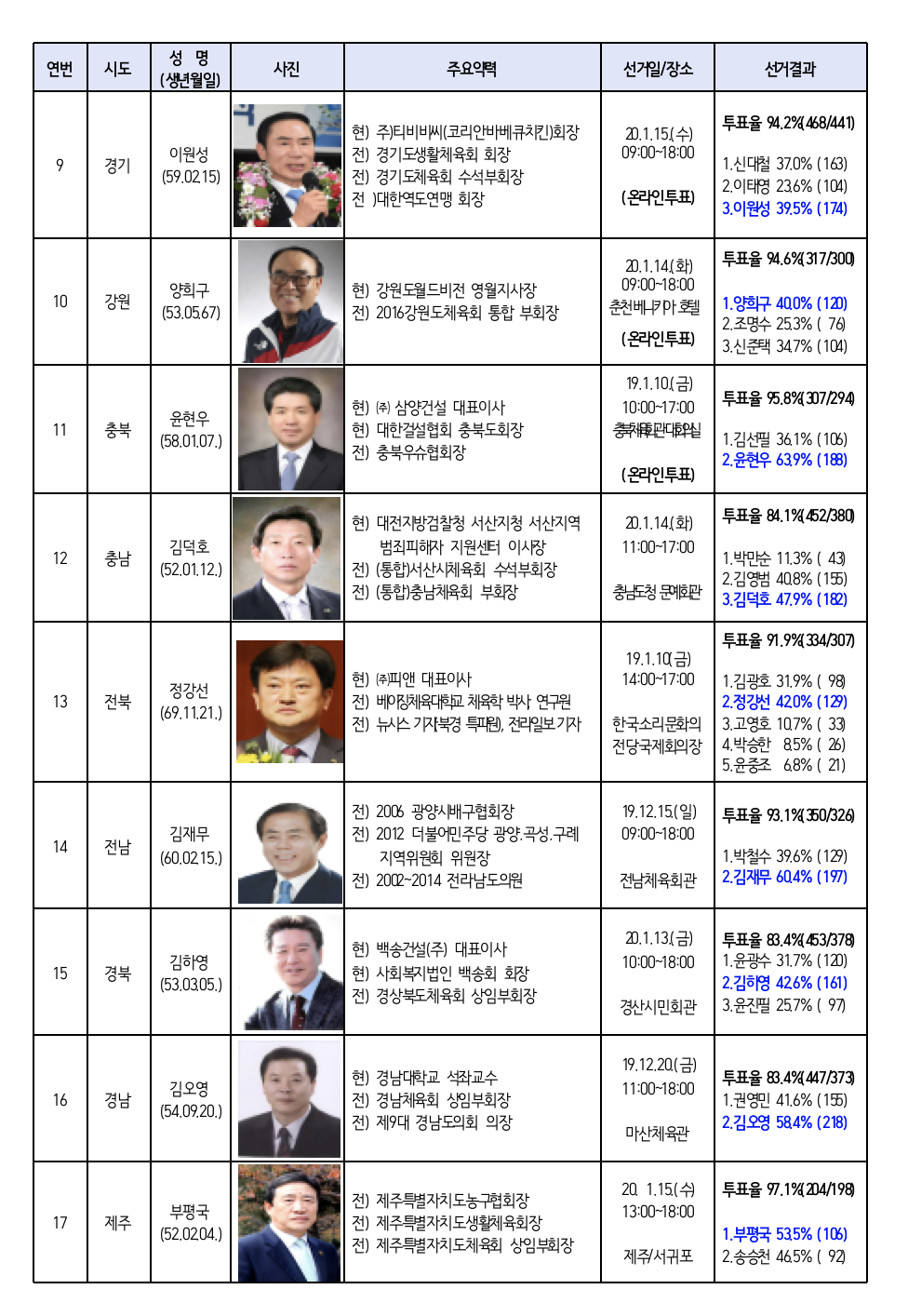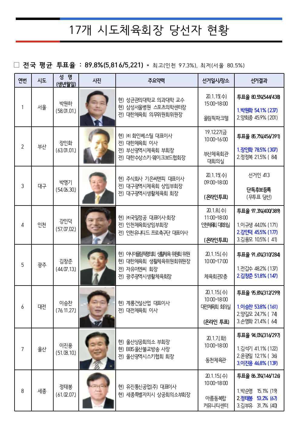 첫 민선 체육회장 선출에 대한 일선 스포츠 현장의 반응은 뜨거웠다. 체육의 자율성과 독립성을 위해 전국 5,816명 대의원 중 무려 5,221명이 투표하여 89.8%의 투표율을 기록한 것이다. 최고 투표율은 인천으로 97.3%가 투표했으며, 최저인 서울도 80.5%의 투표율을 보였다.