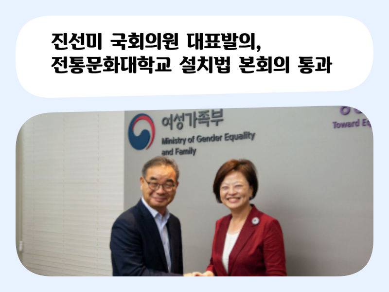 더불어민주당 진선미 국회의원(더불어민주당, 서울 강동 갑)이 대표 발의한 “한국전통문화대학교 설치법 일부개정법률안”이 20일 국회 본회의에서 통과됐다. 앞서 지난 2017년 ‘전통문화대학교 설치법’을 대표로 발의한 진 의원은, 전통문화대학교 측과 지속적 협의를 통해 전통문화사회교육과정을 강동으로 유치했고 올 해부터 시범강좌가 시작될 예정이다.