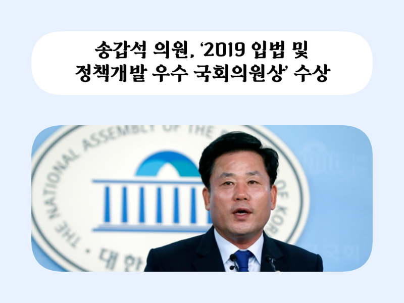- 국회사무처가 선정한 2019 입법 및 정책개발 우수 국회의원 - 제 산업분야에 있어 탁월한 입법 정책 능력 인정받아 |