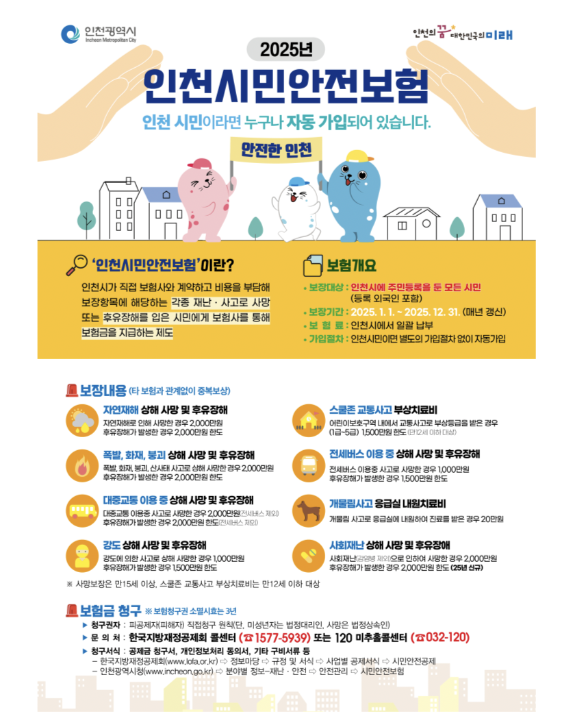 보험금 청구는 사고발생일부터 3년 이내에 가능하며, 사고 지역과 상관없이 사고 당시 인천시민이라면 보장을 받을 수 있다. 개인 보험과 중복 보장도 가능하다. 보험과 관련한 자세한 사항은 보험사 콜센터(☎1577-5939)로 문의하면 된다.