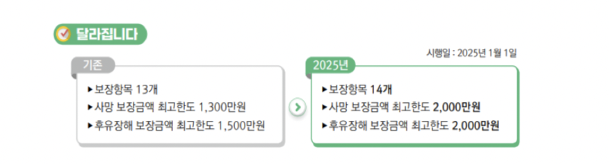 이번 확대 운영으로 기존 7개 보장항목의 최고 보장한도를 상향 조정했다. 기존 ▲자연재해 사망 ▲자연재해 후유장해 ▲폭발·화재·붕괴 사망 ▲폭발·화재·붕괴 후유장해 ▲대중교통 이용 중 사망 ▲대중교통 이용 중 후유장해 ▲사회재난 사망 항목의 보장금액 최고한도를 기존 1,000만~1,500만 원에서 2,000만 원으로 증액한다.