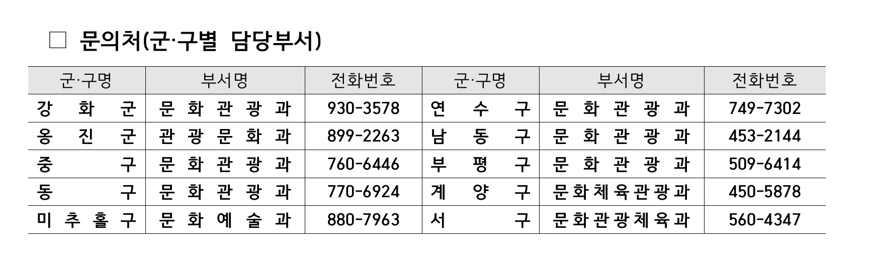 공모와 관련한 자세한 내용은 인천광역시 홈페이지의 고시공고 게시판에서 확인할 수 있으며, 기타 문의는 각 군·구 담당 부서로 하면 된다.