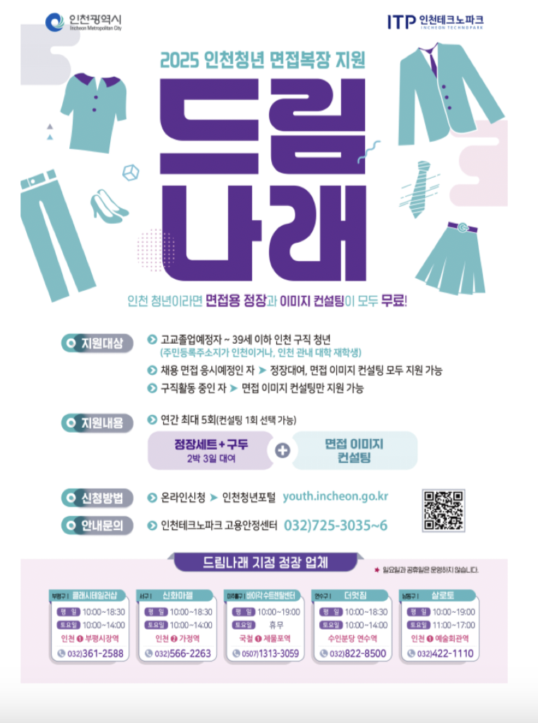 인천광역시(시장 유정복)는 1월 20일부터 청년 취업준비생의 경제적 부담을 줄이고 실질적인 구직 활동을 지원하는 ‘드림나래(인천청년 면접복장 지원)’ 사업을 확대 추진한다고 밝혔다.