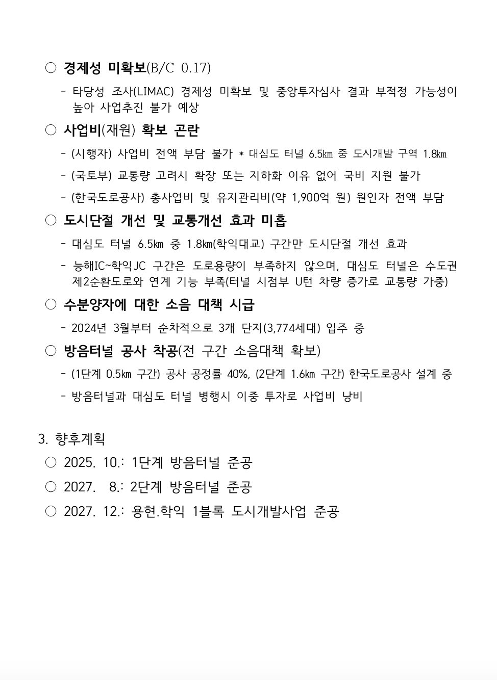 이에 따라 인천시는 한국도로학회의 타당성 검토 결과를 바탕으로 제2경인고속도로 소음 대책으로 방음터널은 적기에 추진하고, 불확실성이 큰 대심도 터널은 추진하지 않기로 정책 방향을 결정했다.