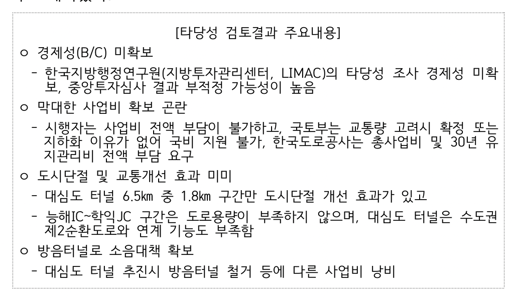인천시는 장기계획으로 검토한 대심도 터널의 사업추진 전반에 관한 사항을 면밀히 분석하기 위해 전문기관인 한국도로학회에 타당성 검토를 의뢰했다. 검토 결과에 따르면 대심도 터널은 ▲경제성 부족(B/C 미확보) ▲막대한 사업비 확보의 어려움 ▲도시 단절 및 개통개선 효과의 미비 ▲방음터널로 소음 대책이 이미 확보된 점 등을 이유로 사업추진의 타당성이 낮다고 평가됐다. 또한, 이중투자로 인한 사업비 낭비 우려도 제기됐다.