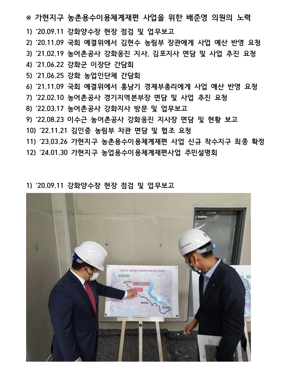 배준영 국회의원(인천 중구·강화군·옹진군)은 11일(목), 가현지구 농촌용수이용 체계재편 사업 착공보고회에 참석해, 가현지구 농촌용수이용체계재편 사업 공사 계획을 보고받았다.
