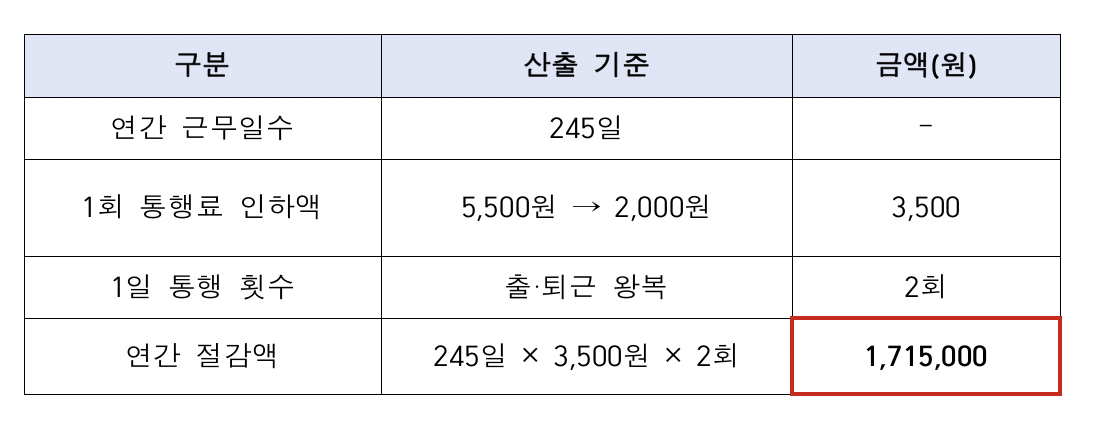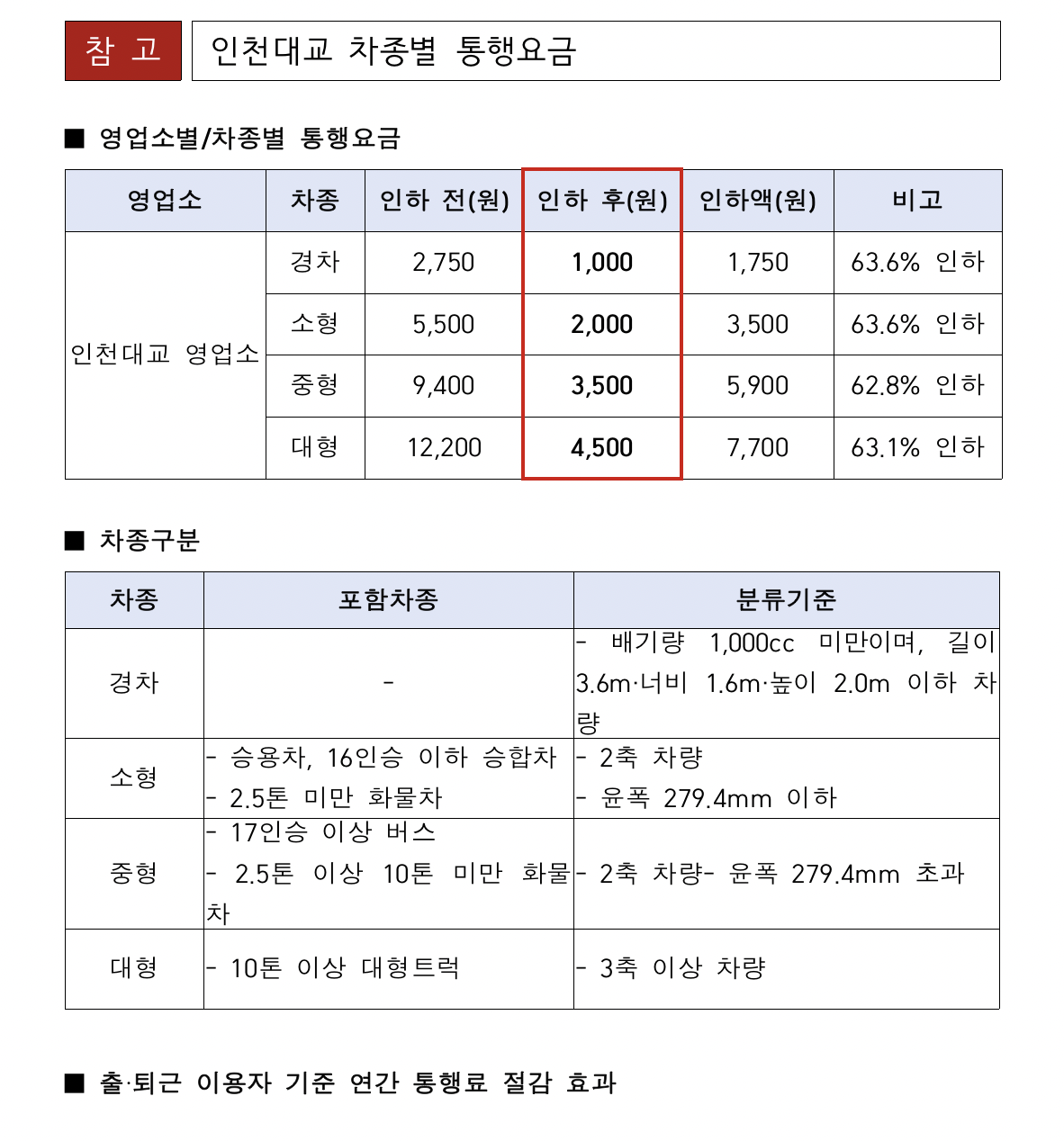 이번 통행료 인하에 따라 소형차(승용차 및 2.5t 미만 화물차)는 기존 5,500원에서 2,000원으로 63.% 인하되며, 중형차(17인승 이상 버스, 2.5~10t 화물차)는 9,400원에서 3,500원, 대형차(10t 이상 화물차 등)는 12,200원에서 4,500원, 경차는 2,750원에서 1,000원으로 각각 요금이 낮아진다.
