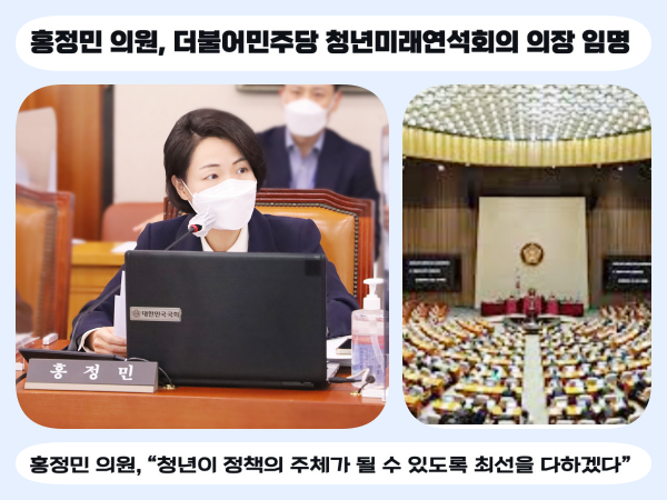 홍정민 의원은 “청년 정책 발굴 및 참여 활성화를 담당하는 중책을 맡게 되어 어깨가 무겁다”며, “이재명 당대표께서도 청년 정책에 각별히 관심을 기울여달라고 당부한 만큼 더 많은 청년이 정책의 주체가 될 수 있도록 최선을 다하겠다”고 말했다.