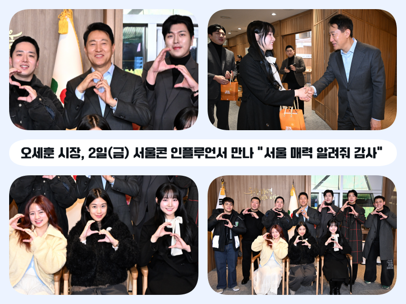 오세훈 서울시장은 2일(금) 오후 4시 서울시청 집무실에서 지난해 12.29.(월)부터 사흘간 DDP 일대에서 열린 ‘2025 서울콘’ 참가 인플루언서 6인을 만나 참신한 콘텐츠로 ‘서울’을 널리 알려준 데 감사를 전하고, 전 세계에 ‘매력도시 서울’을 홍보하기 위한 아이디어를 청취했다.