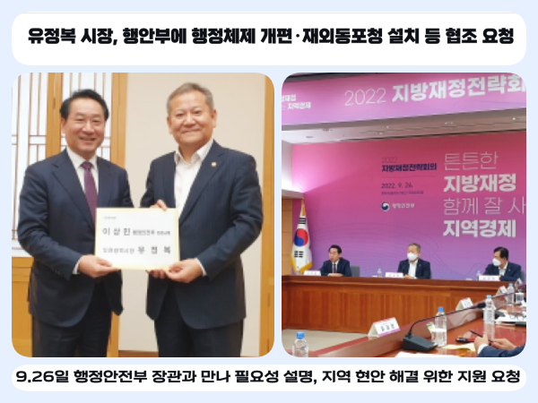 인천광역시는 유정복 시장이 지난 9월 26일 정부서울청사에서 이상민 행정안전부 장관을 만나 ▲인천시 행정체제 개편, ▲재외동포청 인천 설치, ▲특별교부세 300억원 지원 등 지역 현안 해결을 위한 협조를 요청했다고 밝혔다.
