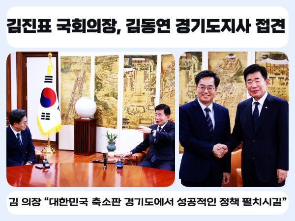 이에 김 지사는 “의장님 말씀을 유념하고 더 나은 경기도를 만들겠다”며 “지역화폐 발행, 도시재생, GTX 조기 추진, 경기북부특별자치도 설치 등 경기도 현안 문제에 대해 의장님과 국회의 관심과 지원을 당부드린다”고 말했다.