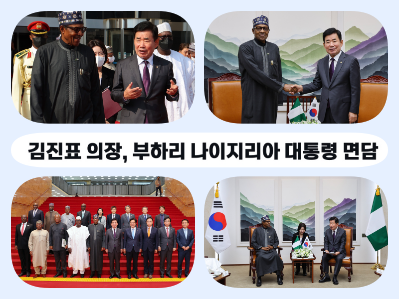 김진표 국회의장은 27일 오후 의장접견실에서 무하마두 부하리 나이지리아 대통령을 접견하고 백신 등 의료분야 협력 확대, 인프라 등 개발협력 강화, 의회간 교류 등에 대해 논의했다. 나이지리아 대통령의 방한은 2012년 조너선 대통령 이후 10년 만으로, 부하리 대통령은 한국 정부가 세계보건기구(WHO)와 공동 주최한 「2022 세계 바이오 서밋」(10.25.-26.) 참석차 방한했다.