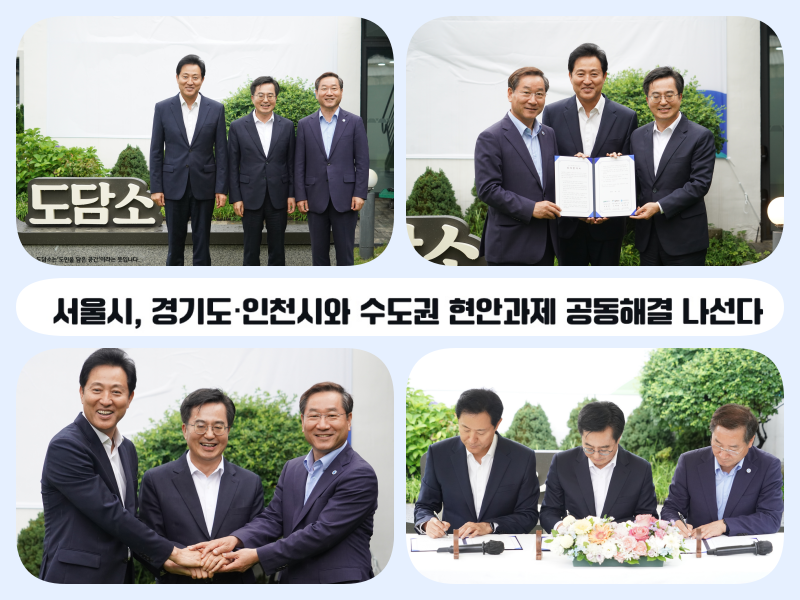 - 7.11.(화) 수도권 3개 시・도 지자체장들 만나 ‘수도권 공동생활권 협력을 위한 업무협약’ 체결 - 수도권 폐기물 처리, 광역 교통망 구축 등 공동현안 10개 과제 해결 위해 공동노력 합의 - 수도권 주요현안 대응의 추진력과 수도권 주민 삶의 질 향상 기대 |