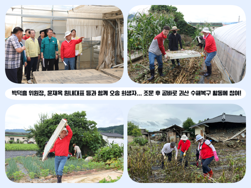 박덕흠 위원장, 윤재옥 원내대표 등과 함께 오송 희생자를 위한 합동분향소 조문 후 곧바로 괴산 수해복구 활동에 참여! |