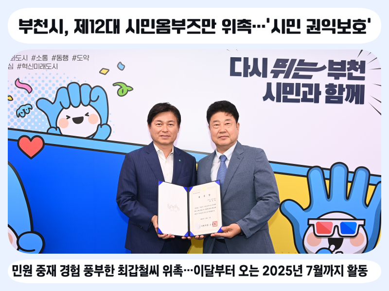 시는 부천시 시민옴부즈만 추천위원회 심사와 부천시의회 위촉 동의 절차 등을 거쳐 제12대 시민옴부즈만으로 제7대 부천시의회 의원, 제10대 경기도의회 의원, 부천시새마을회 오정동협의회 회장, 오정동 주민자치위원회 위원장을 역임하여 시민권익 보호 및 민원 중재 경험이 풍부한 최갑철씨를 위촉했다.