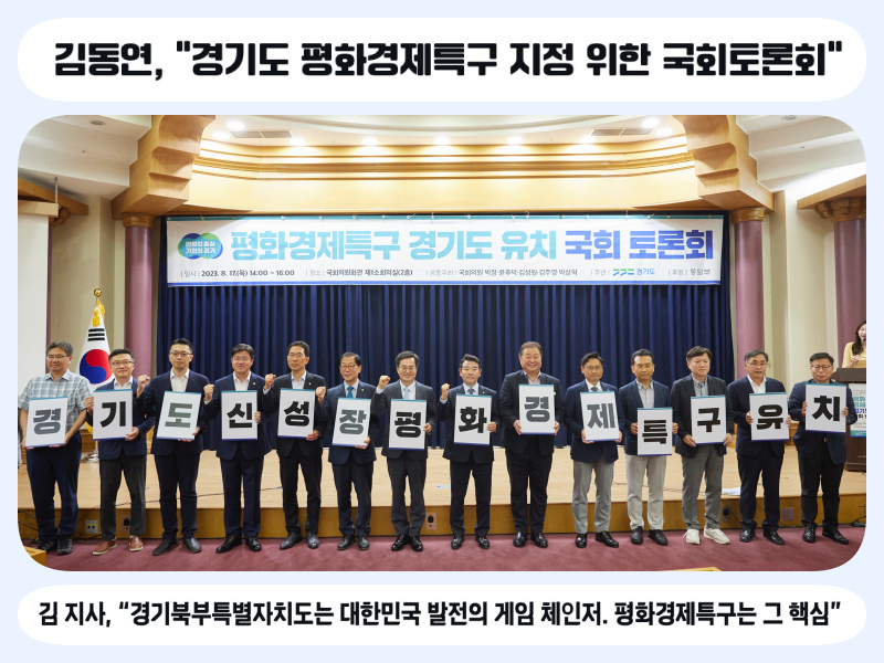 ○○ 8월 17일 ‘경기도 평화경제특구 지정을 위한 국회토론회’ 개최 - 한반도의 장기적 번영된 미래를 설계하는 ‘경기도 평화경제특구’ 구상 ○ 김동연 지사 “경기북부는 어떤 곳보다 성장잠재력이 큰 곳. 경기북부특별자치도를 통해 경기북부가 안고 있는 문제 한 번에 풀 수 있어” |
