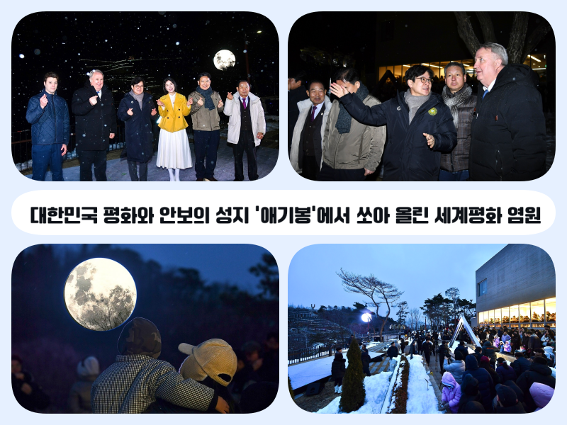 한반도에서 유일하게 북한의 민가가 보이는 가운데 장엄한 자연의 파노라마를 감상할 수 있는 김포시 애기봉평화생태공원에서 24일 전통과 현대가 어우러진 정월대보름 행사가 펼쳐졌다. 국내외 관광객, 이주배경민 등 애기봉평화생태공원에 모인 세계인은 긴장감이 감돌았던 최전방 접경지역이 세계 평화를 기원하는 상징적 장소로 변했음을 실감하며 분단 이래 접경지역에서 최초로 펼쳐지는 「소원을 비추는 달빛 레이저 쇼」 행사로 세계에 평화의 메시지를 전했다.