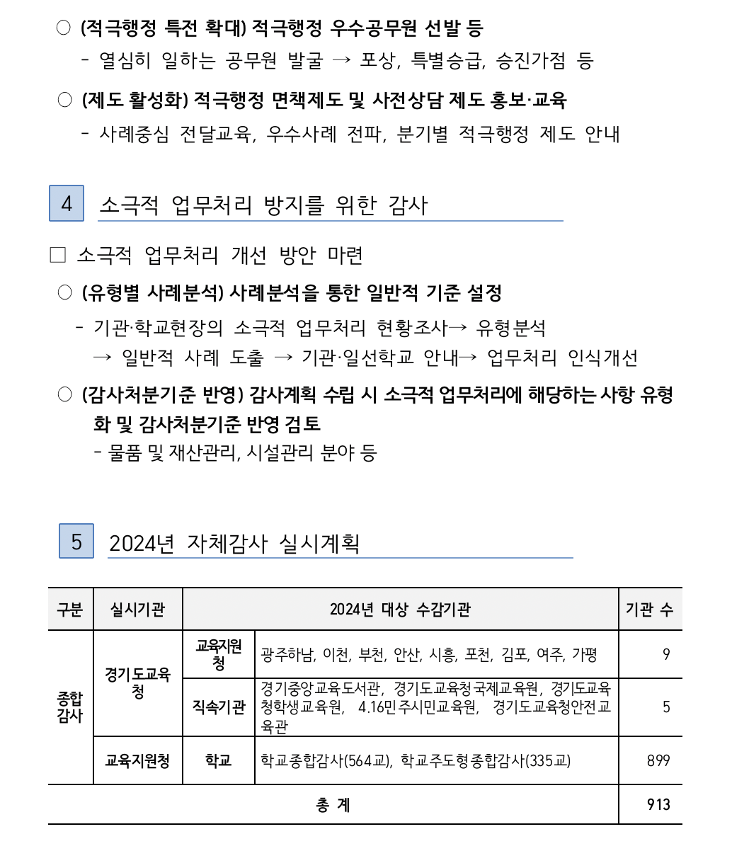 소극적 업무처리 방지를 위해서는 ▲유형별 사례분석을 통한 일반적 기준 설정 ▲기관·일선학교 등 현장 안내 ▲감사처분기준 반영 등을 통해 실효성 있는 감사를 실시한다.