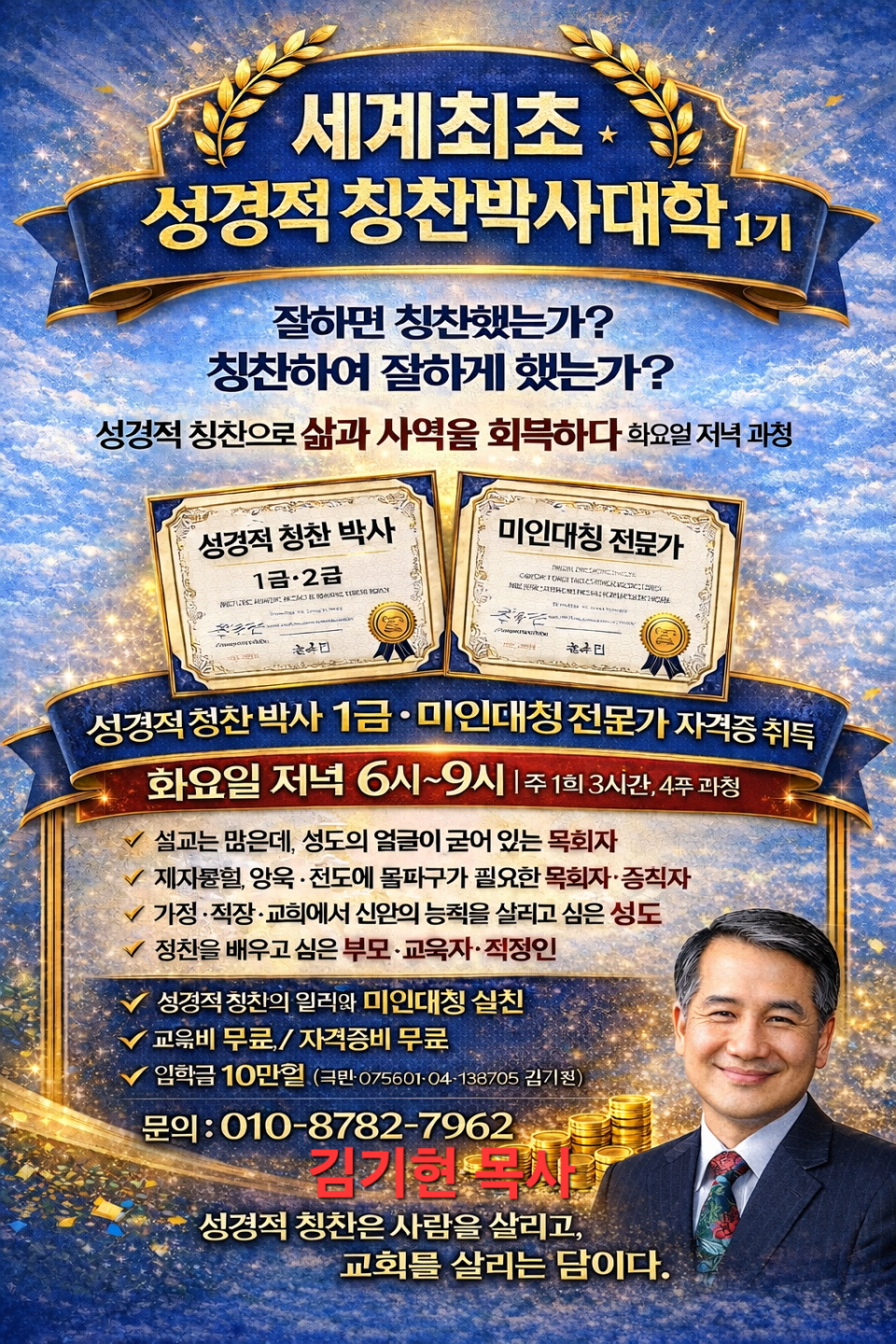 기독교 2000년 역사 속에서 성경적 칭찬을 하나의 신학·사역·교육 체계로 정립한 세계 최초의 교육과정인 ‘성경적칭찬박사대학’ 1기 과정이 오늘 2월 3일(화) 개설된다.