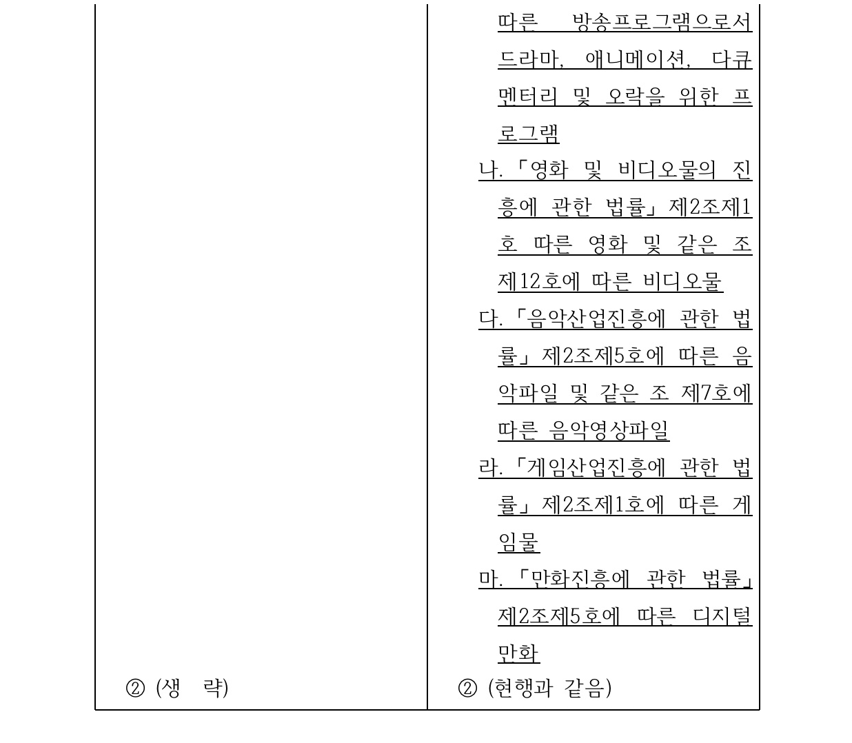- 콘텐츠 제작 투자비용 세액공제율 상향 - 영화, 공연, 온라인 문화콘텐츠 부가가치세 면세 - 수도권 과밀억제권역 내 콘텐츠 제작 중소 창업기업 세액감면 적용 |