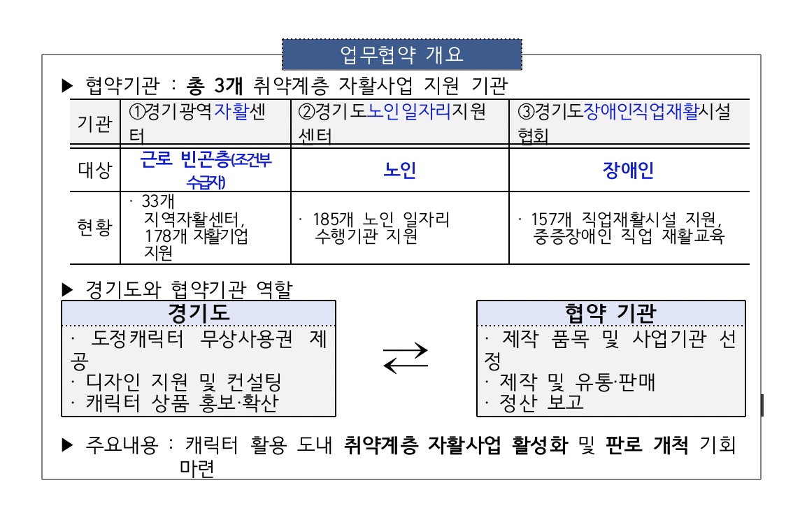 경기도는 10일 도청 홍보기획관실에서 이 같은 내용의 ‘캐릭터 활용 취약계층 자활사업 활성화 업무협약’을 체결했다.