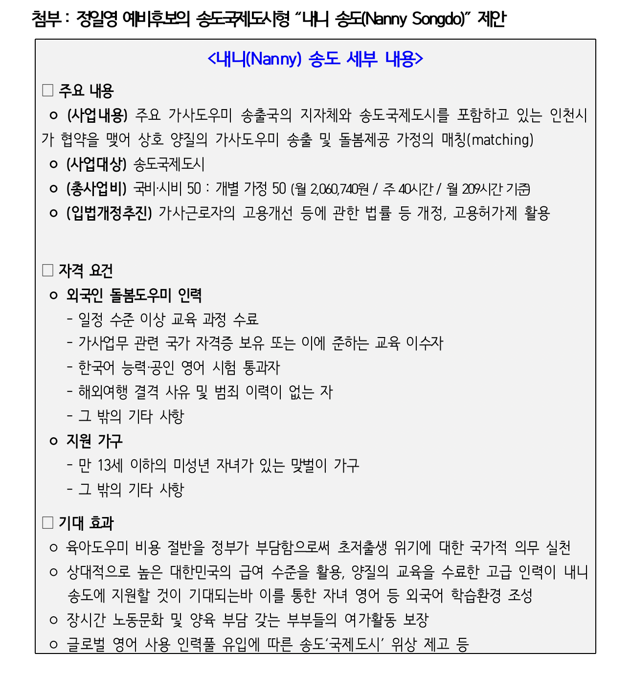 정 의원이 제시한 내니송도의 주요 내용은 ▲돌봄도우미 인력 주요 송출국(필리핀 등)의 지방자치단체간 협약 체결, ▲ 송출국은 돌봄도우미에 대하여 일정 수준의 교육과 영어 등 공인시험 성적, 그리고 범죄이력 유무 등을 보증, ▲ 외국인 돌봄도우미에게 약 206만 원 수준인 최저시급 이상의 급여를 지급, ▲ 외국인돌봄 도우미 보수는 국비 또는 시비로 반액을 지원해 실제 개별 가정의 비용 부담은 100만 원 수준을 유지하는 것 등이 있다.