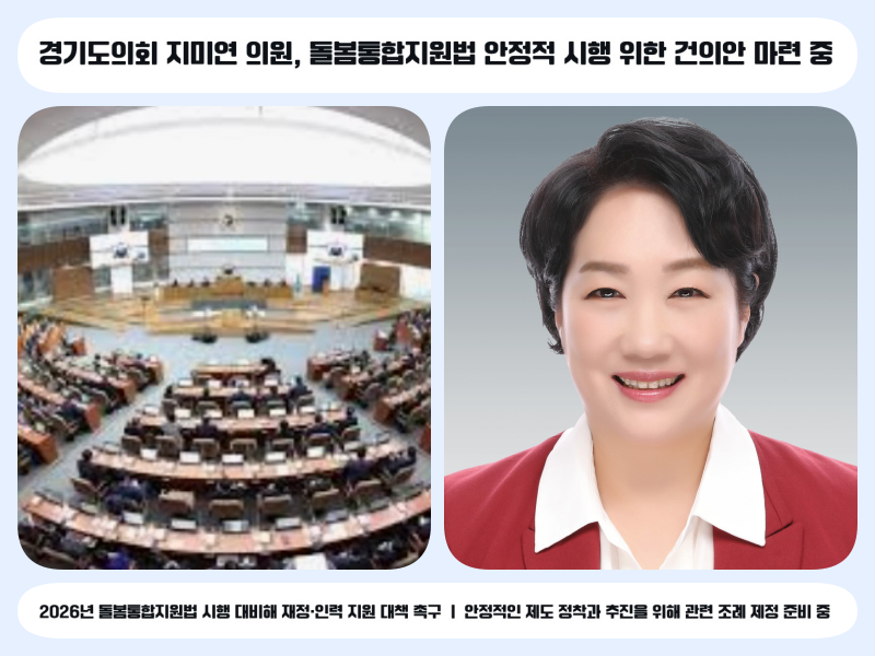 경기도의회 보건복지위원회 지미연 의원(국민의힘, 용인6)은 2026년 3월 시행 예정인 「의료·요양 등 지역 돌봄의 통합지원에 관한 법률」(돌봄통합지원법)에 대비해, 안정적인 돌봄통합체계 마련을 위한 재정 지원과 인력 확충을 촉구하는 건의안을 준비하고 있다.