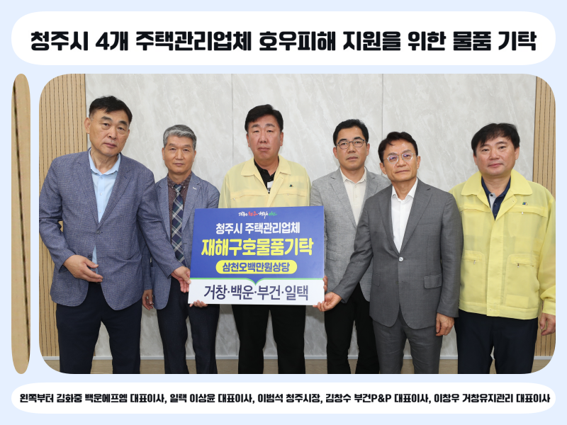 거창유지관리(대표이사 이창우), 백운에프엠(대표이사 김화중), 부건P&P(대표이사 김창수), 일택(대표이사 이상윤) 등 4개 주택관리업체는 18일 청주시청을 찾아 이번 집중호우로 피해를 입은 시민들에게 전달해달라며 선풍기, 이불 등 3,500만원 상당의 물품을 청주시에 기탁했다.