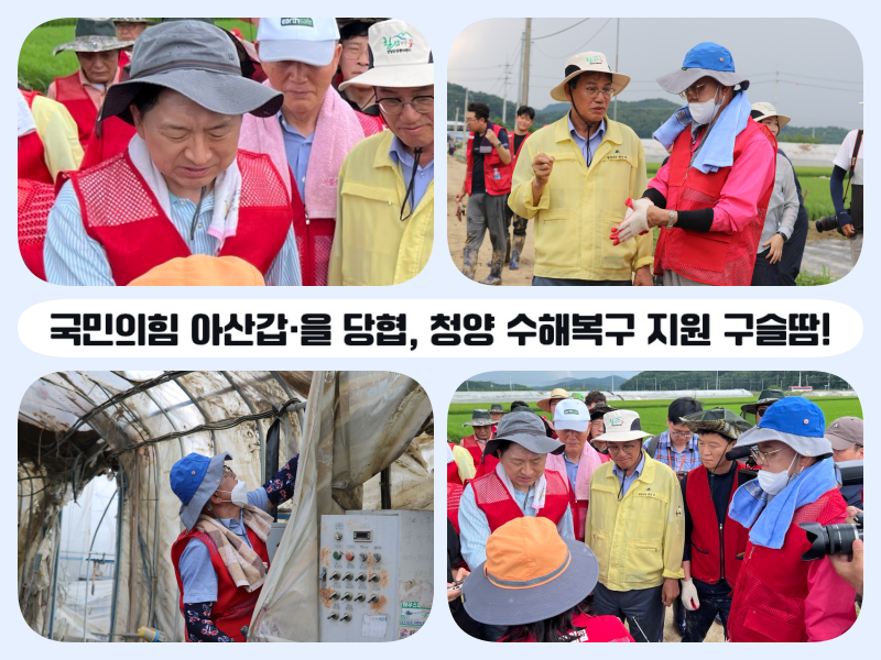 ▷ 국민의힘 충남도당 수해복구 봉사활동… 아산갑·을 당협 참여 ▷ 이명수 의원 “조속한 피해복구와 주민들의 일상회복을 최우선으로, 중장기적인 재해예방 및 대비책 마련에 더욱 노력할 것” |