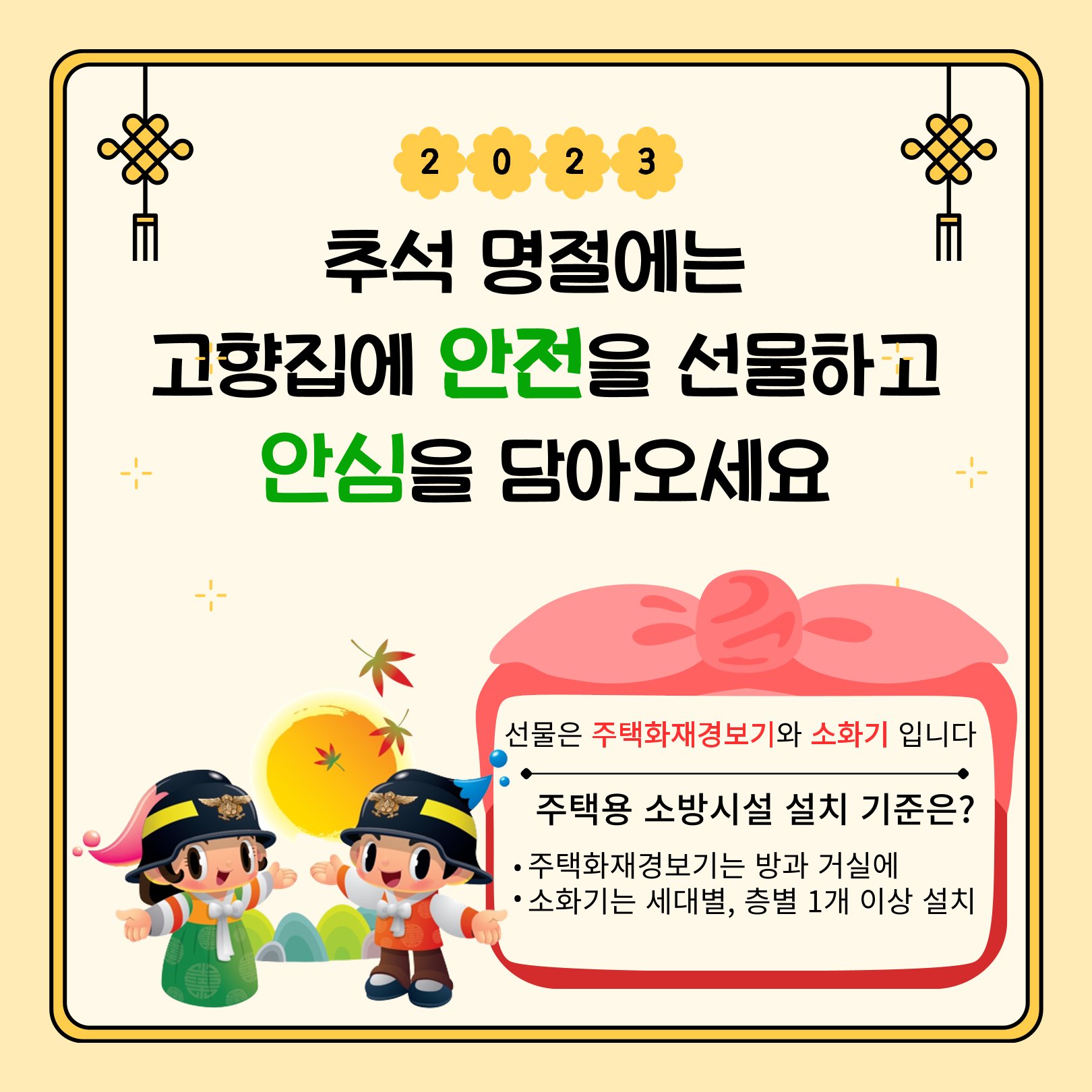 이번 홍보는 ‘추석 명절에 주택용 소방시설을 선물하기’를 슬로건으로 하여 주택용 소방시설 종류 및 원스톱 지원센터 운영 등 관련 정보를 카드뉴스로 제작하여 소방서 홈페이지를 비롯한 지역 내 전광판, 맘 카페, 화재예방 캠페인 등을 통해 전방위로 홍보하고 있다.