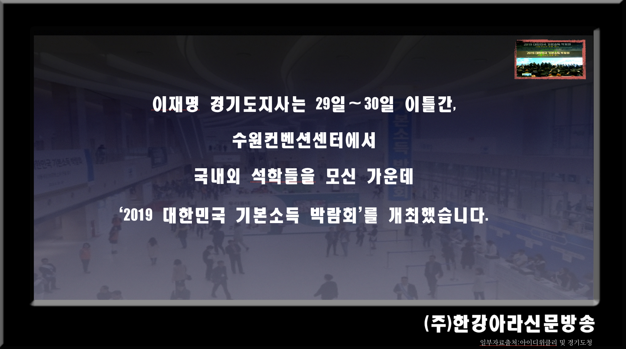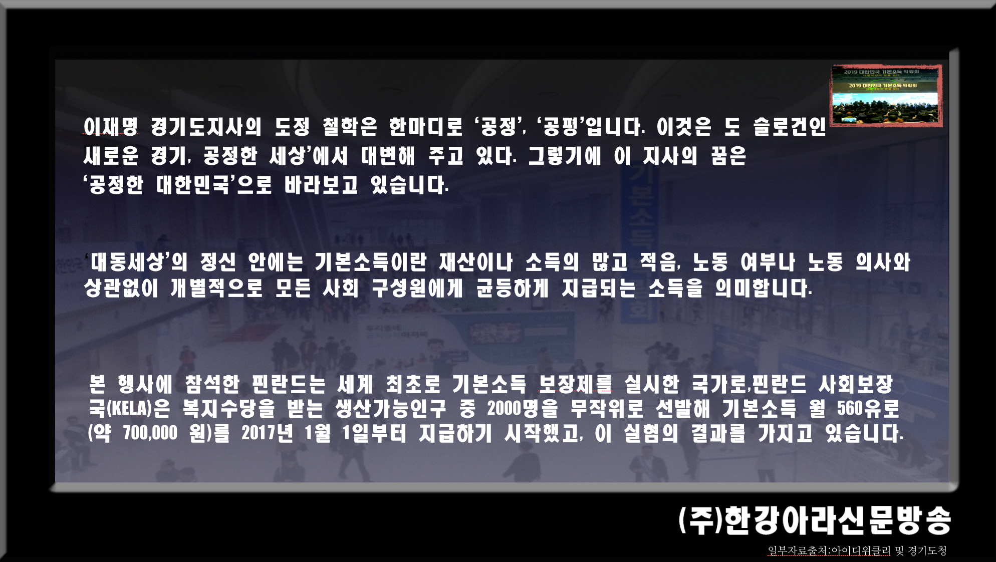 ○ 경기도, ‘2019 대한민국 기본소득 박람회’ 개최 - 일시 : ′19년 4월 29일~30일(2일간) / 장소 : 수원컨벤션센터 - ‘기본소득 국제컨퍼런스’, ‘기본소득, 지역화폐 전시 및 체험의 장’ 등 2개 부문 - 세계최고 전문가 발표 및 토론, 국민 관람 및 체험 어우러진 ‘공론화 축제의 장’ - 도, “기본소득, 지역화폐의 전 국민적 공감대 형성하는 기폭제 되는 축제 될 것” |