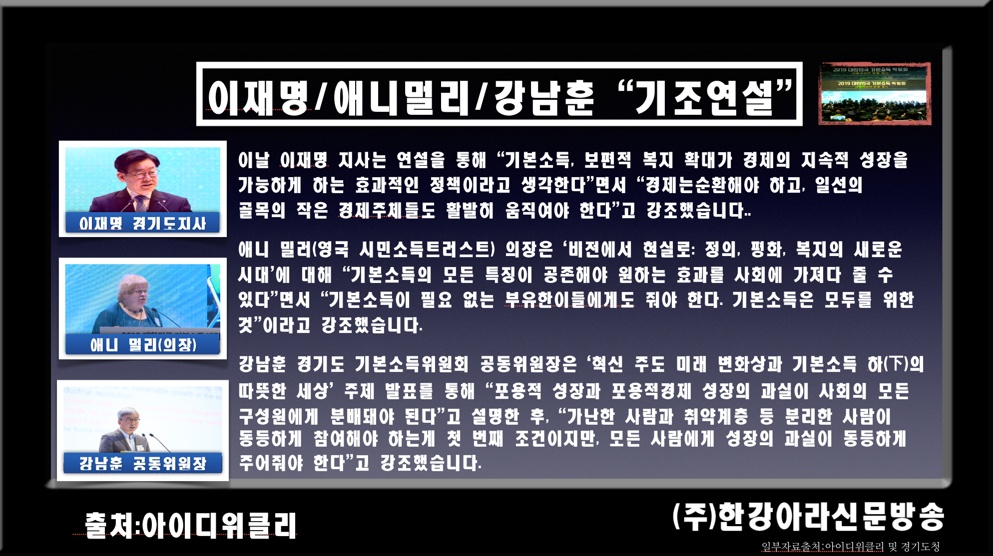 먼저, 행사 첫날인 29일에는 기본소득지구네트워크(BIEN) 공동설립자이자 영국 시민소득트러스트 의장인 애니밀러(Annie Miller)와 경기도 기본소득위원회 공동위원장과 기본소득한국네트워크 이사장을 겸임하고 있는 강남훈 교수(한신대)가 공동 기조발제자로 나서 각각 ‘비전에서 현실로: 정의, 평화, 복지의 새로운 시대’와 ‘혁신 주도 미래 변화상과 기본소득 하의 따뜻한 세상’라는 주제의 기조연설을 통해 컨퍼런스의 서막을 열었다.