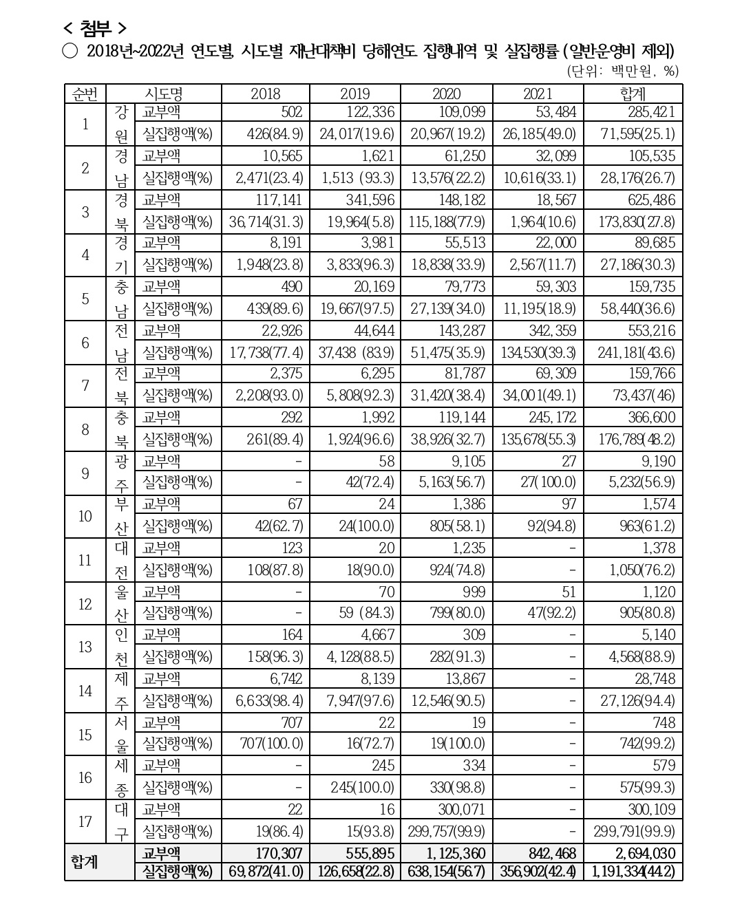 < 첨부 : 2018년~2021년까지 행정안전부 「재난대책비」 교부 및 실집행 내역 >