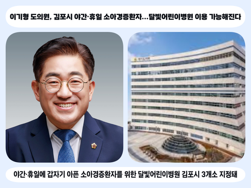 경기도의회 건설교통위원회 이기형 의원(더불어민주당, 김포4)이 오는 6월 12일부터 김포시 내 3개 병·의원이 달빛어린이병원으로 지정되어 평일 야간·휴일 진료를 시작한다고 밝혔다.