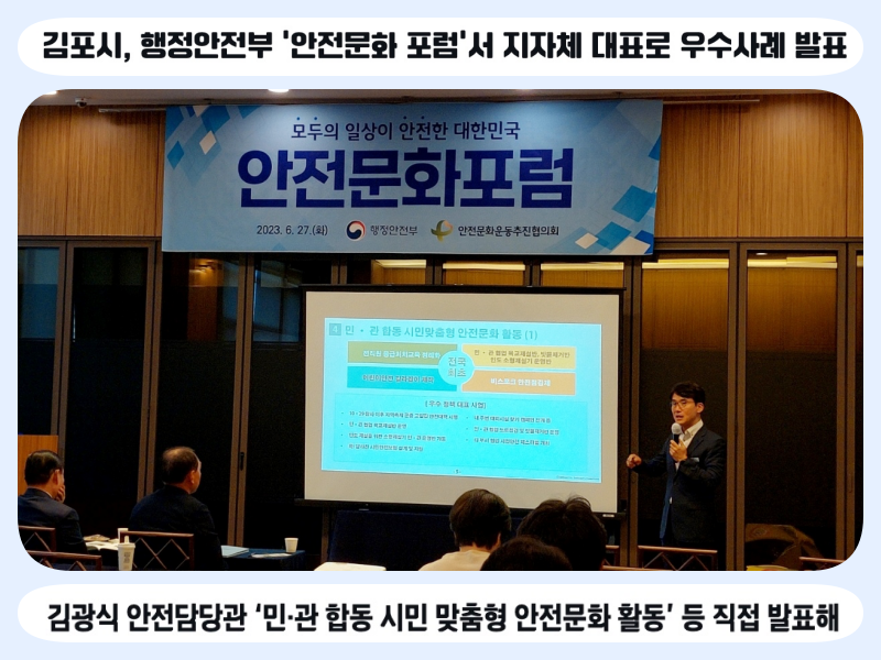 안전문화 활동 우수사례 공유·확산 및 발전방안 모색을 위해 지난 27일 행정안전부 주관으로 열린 ‘안전문화 포럼'에서 김포시(시장 김병수)가 기초자치단체 대표로 우수사례를 발표했다.
