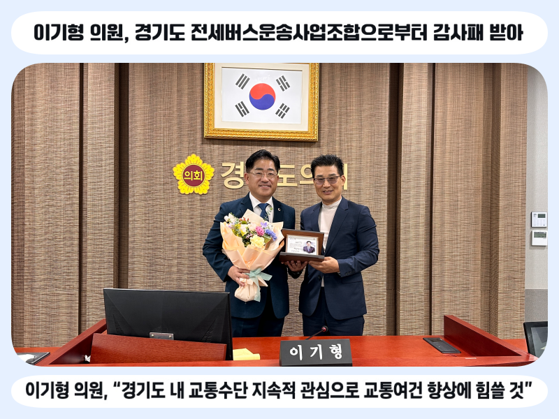 경기도의회 건설교통위원회 이기형 의원(더불어민주당, 김포4)은 금일(26일) 경기도 전세버스운송사업조합으로부터 전세버스 운송사업 활성화와 보행자 안전과 서비스 향상 도모했다는 공로를 인정받아 감사패를 받았다.
